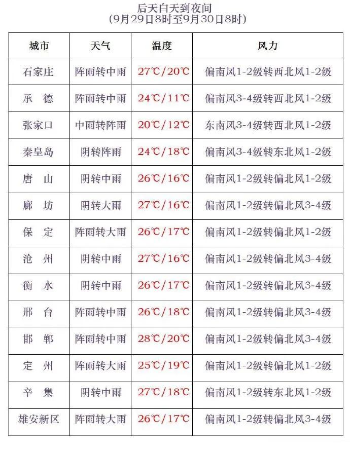 29日夜间到30日,张家口中北部、承德北部阴有小雨转晴,其他地区阴有中雨转多云,局地有大雨。