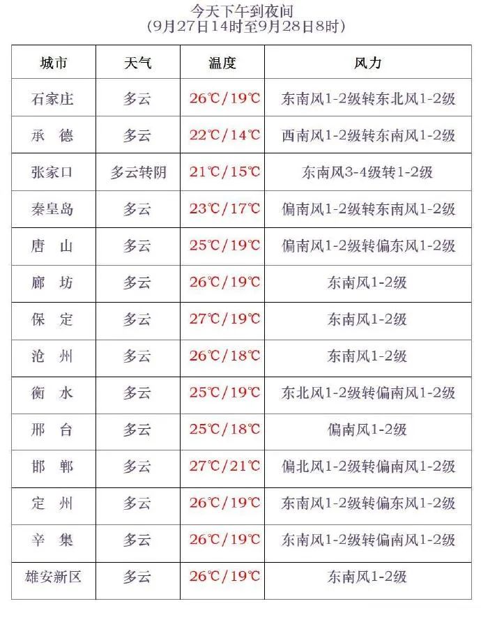 今天下午到夜间,张家口、承德西部、保定北部多云间阴有分散性阵雨或零星小雨,其他地区多云间晴。最高气温,张家口北部、承德北部14~18℃,其他地区19~29℃。最低气温,张家口北部、承德北部8~12℃,其他地区13~21℃。