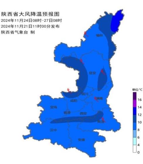 24-25日过程日平均气温全省大部下降8~10℃,局地下降12℃以上。预计最低气温出现在27日清晨:陕北、秦巴山区-15~-7℃,关中西部及北部-9~-7℃,商洛-8~-6℃,关中南部、汉江河谷-6~-3℃。