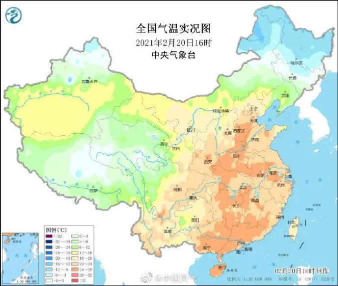 据中国气象台消息,截至20日16时,华北、黄淮一带大范围刷新2月气温历史纪录!