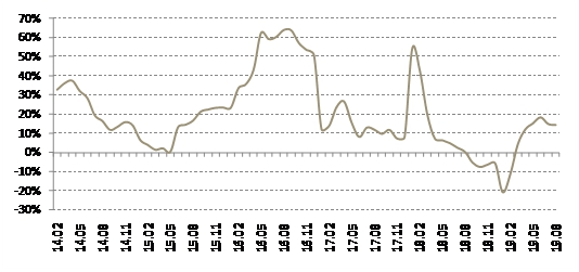 报告显示,2019年1-8月份,重点监测的全国100个城市宅地成交面积为39388万平方米,同比增长9.2%。该增速相比1-7月份13.8%的数值有明显收窄。观察宅地的历史交易走势,可以看出,2016年第四季度房地产政策开始收紧,滞后一个季度后即2017年第一季度,宅地市场基本面也发生了变化。从2017年开始,撇去部分交易结构干扰和季节性异动等因素,大趋势看,宅地交易市场以降温为主要特征。