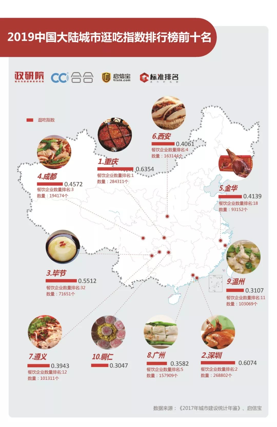 “2019中国大陆城市逛吃指数排行榜”显示,重庆、广东深圳、贵州毕节、四川成都、浙江金华、陕西西安、贵州遵义、广东广州、浙江温州和贵州铜仁位列前十名。其中,贵州省的城市表现优异,前十名中占据了三个,可谓大赢家。因为气候、饮食习惯等因素,南方城市更适宜夜宵生活,入榜前50的城市比例高达66%。