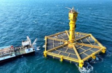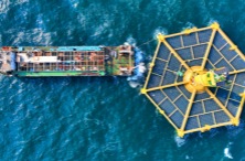 这是离岸约130海里的黄海中部青岛国家深远海绿色养殖试验区,右侧为我国自主研制的大型全潜式深海智能渔业养殖装备——“深蓝2号”(1月12日摄,无人机照片)。近日,在离岸约130海里的黄海中部青岛国家深远海绿色养殖试验区,中国自主研制的大型全潜式深海智能渔业养殖装备“深蓝2号”迎来服役以来首次三文鱼收鱼作业。