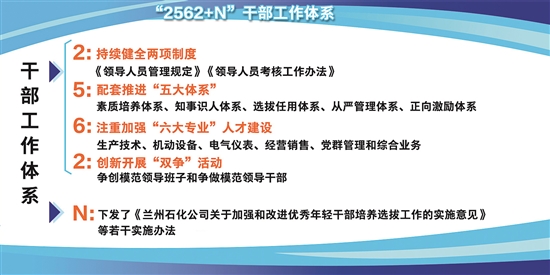 兰州石化公司创新工作机制,持续健全《领导人员管理规定》《领导人员考核工作办法》两项制度,配套推进领导人员素质培养体系、知事识人体系、选拔任用体系、从严管理体系、正向激励体系“五大体系”,注重加强生产技术、机动设备、电气仪表、经营销售、党群管理和综合业务“六大专业”人才建设,创新开展争创模范领导班子和争做模范领导干部“双争”活动,下发了《兰州石化公司关于加强和改进优秀年轻干部培养选拔工作的实施意见》等若干实施办法,逐步形成了 “2562+N”干部工作体系,全力提升干部队伍“选育管用”全链条工作质量和水平,打造高素质的干部队伍。