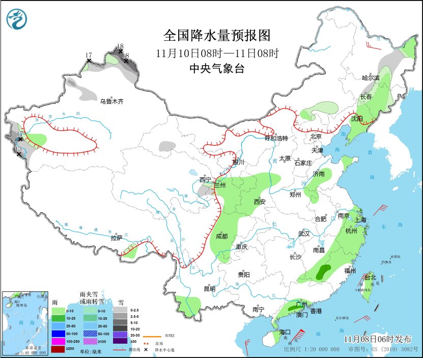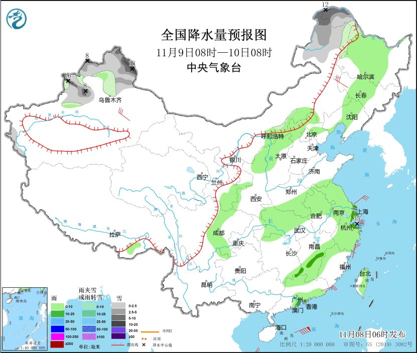 11月8日08时至9日08时,新疆北部和西部、西藏东南部、川西高原南部等地部分地区有小到中雪或雨夹雪,其中,新疆阿勒泰山区、塔城、伊犁河谷和沿天山等地部分地区有大雪,局地暴雪(10~18毫米)。甘肃东南部、陕西西南部、四川东部和南部、重庆、云南、贵州北部和西部、湖北、江苏南部、上海、浙江北部和东部、广东东南沿海、台湾岛等地部分地区有小到中雨。内蒙古中部、新疆沿天山地区、浙江北部等地部分地区有4~6级风(见图3)。