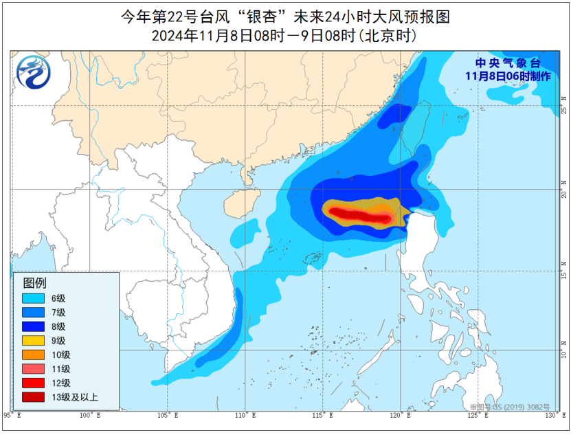 预计,8日08时至9日08时,受冷空气和台风“银杏”的共同影响,东海南部、台湾海峡、台湾以东洋面、巴士海峡、南海西部、福建沿海、台湾岛沿海、广东东部沿海、西沙和中沙群岛、东沙群岛将有6-8级、阵风9-10级的大风,南海东北部和中东部海域将有9-11级、阵风12-13级的大风,台风“银杏”中心经过的附近海域风力可达12-15级,阵风16-17级(见图2)。