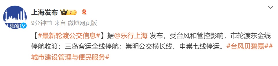 受台风和管控影响,市轮渡东金线停航收渡;三岛客运全线停航;崇明公交横长线、申崇七线停运。