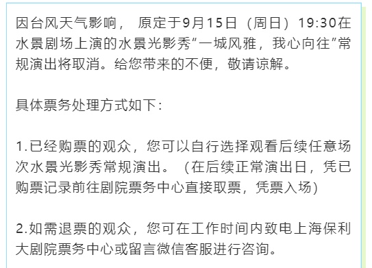 受天气因素影响原定于今晚(9月15日)19:30在上海保利大剧院·水景剧场上演的“水景光影秀”取消