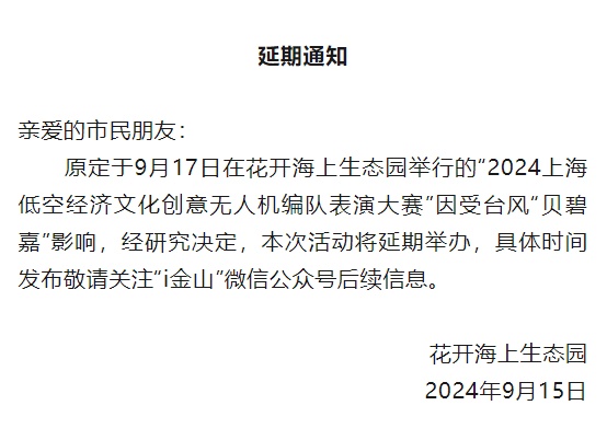 “2024上海低空经济文化创意无人机编队表演大赛”因受台风“贝碧嘉”影响延期举办