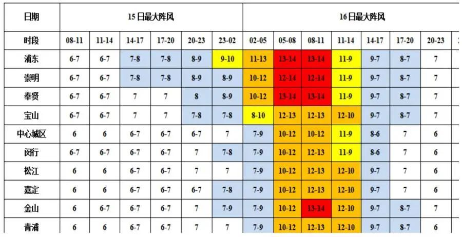 十级大风:15日22时至16日11时;十二级及以上大风:16日00时至16日09时(强风区域在浦东、崇明、奉贤、金山,宝山、松江南部、闵行南部等地,局部区域可达13~14级)。