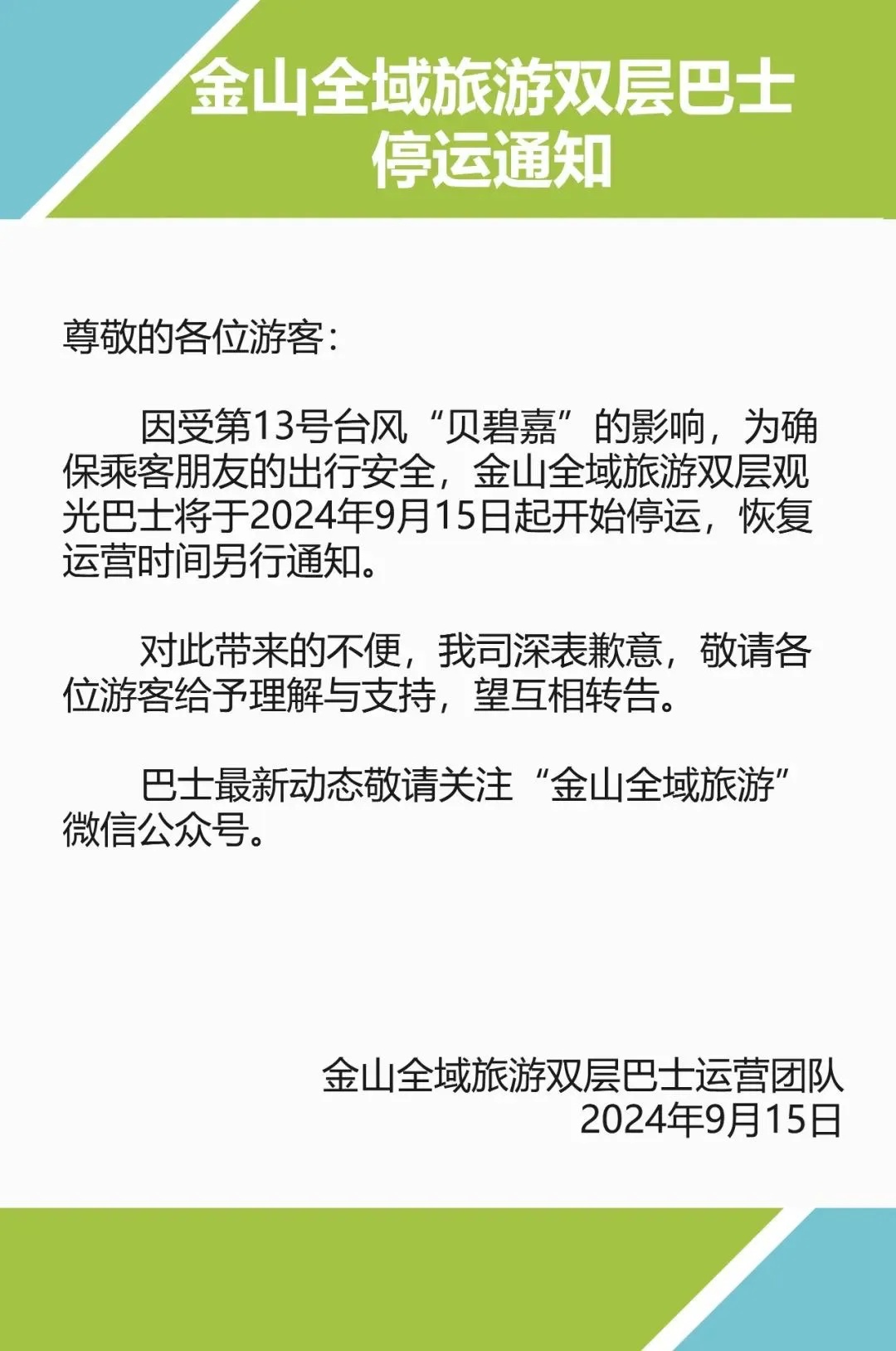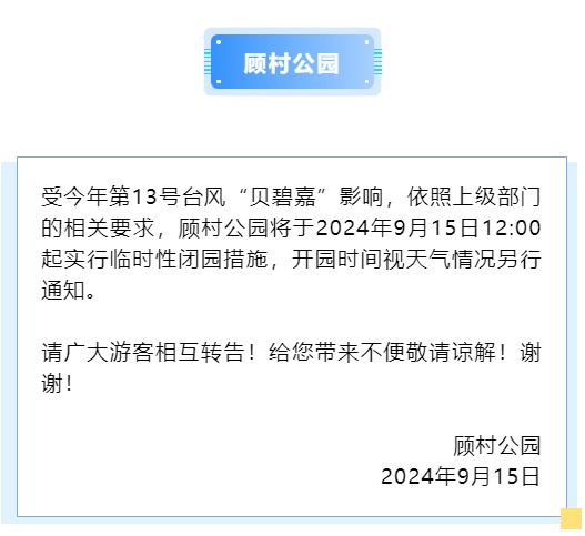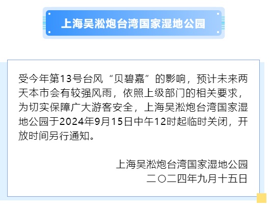 记者从闵行区绿化市容局获悉,受第13号台风“贝碧嘉”影响,为确保游客出行安全,闵行区53座城市公园于9月15日12:00起全部闭园,开园时间另行通知。