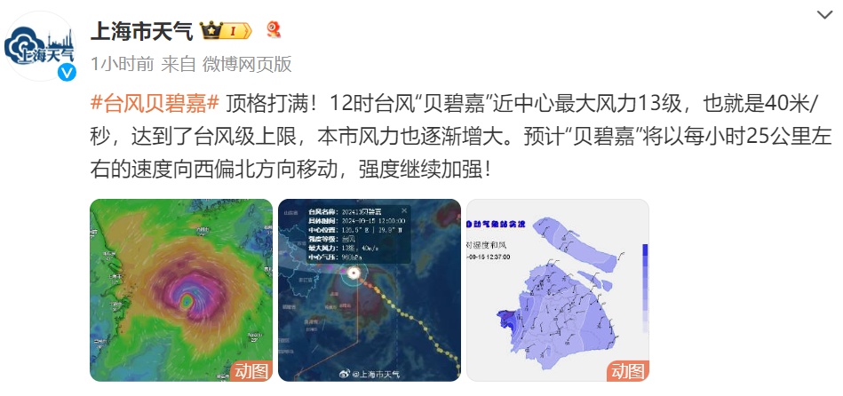今年第13号台风“贝碧嘉”今天11时中心位于距离上海浦东南汇嘴东偏南约470公里的东海海面上,本体云系距离上海东部沿海地区不足300公里。昨天半夜“贝碧嘉”已加强为台风级别,目前维持台风级,强度仍在进一步增强,预计最强可达强台风级。目前“贝碧嘉”正以每小时20-25公里的速度向西偏北方向移动,预计“贝碧嘉”将于16日凌晨到上午在上海浦东到浙江舟山一带登陆,登陆强度为台风或强台风级,登陆后强度逐渐减弱。