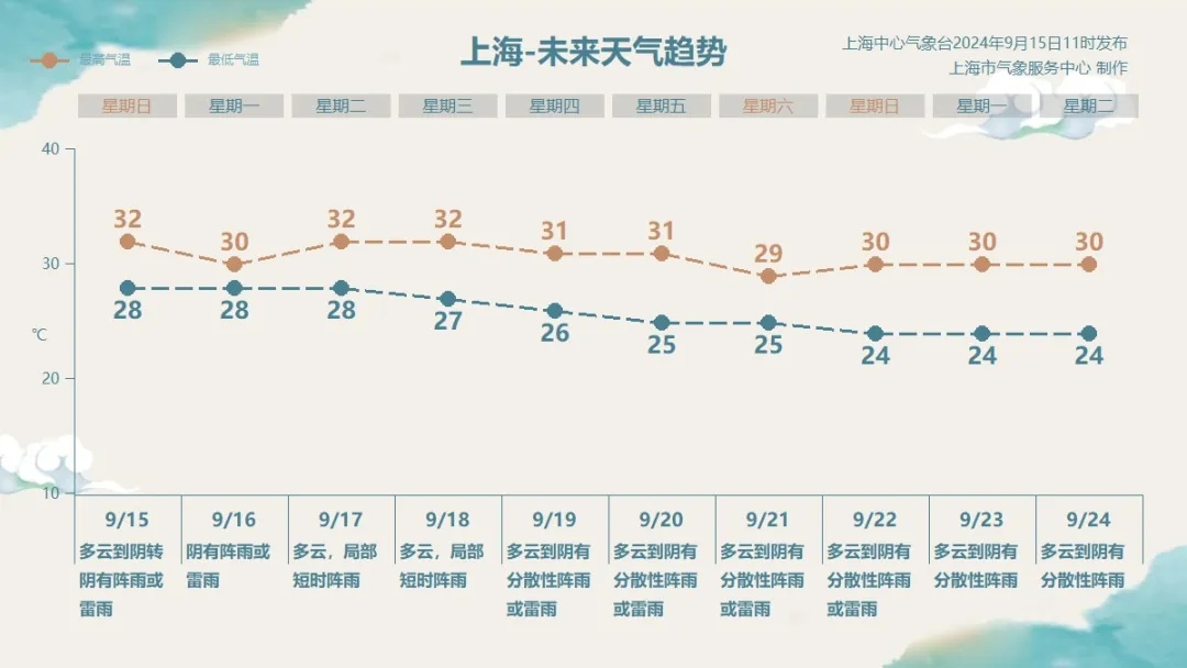 【后期趋势】节后上海主要处在副热带高压边缘,海上还有热带系统活动,总体以多云天气为主,有些短时阵雨。气温多在24~32℃之间,后期气温有所下调,早晚添凉意。