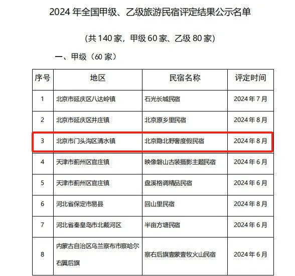 近日,全国旅游标准化技术委员会发布2024年全国甲级、乙级旅游民宿评定结果公示名单。经旅游民宿自愿申报、省级等级旅游民宿评定机构初审,全国旅游标准化技术委员会最终评定后,认定140家旅游民宿基本达到甲级、乙级旅游民宿标准,其中,我区“门头沟小院”精品民宿“隐北·野奢度假民宿”上榜,获评全国甲级民宿。截至目前,门头沟区共有全国甲级民宿三家,一瓢客栈、百花山社精品民宿及隐北·野奢度假民宿。