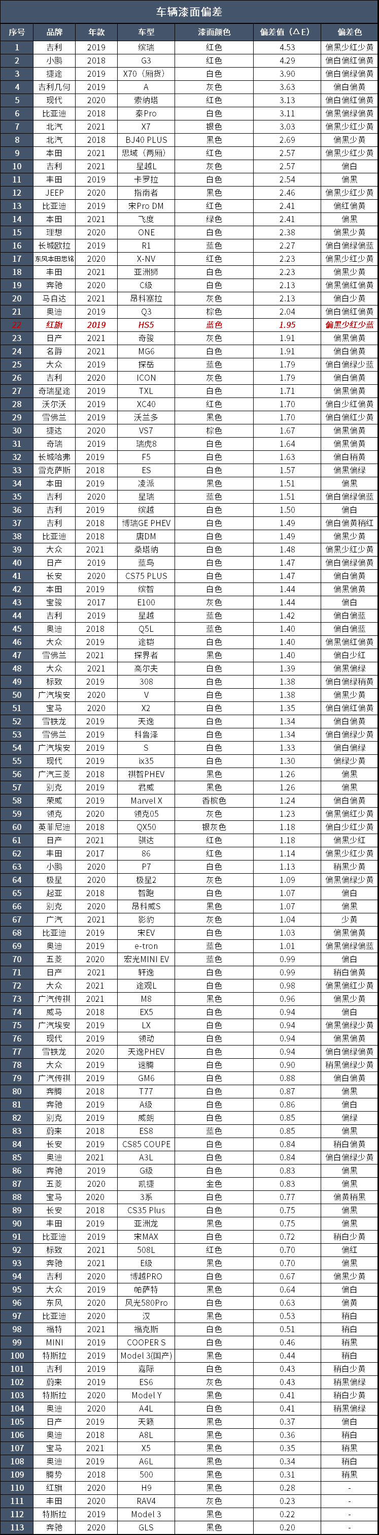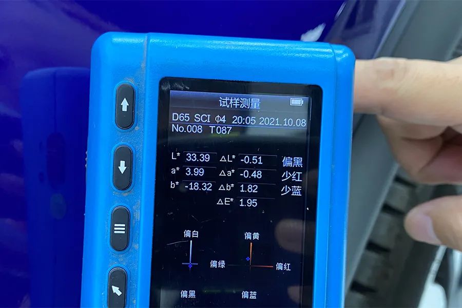 经过测试,最大色差值位于前保险杠处,色差值为1.95ΔE,比基准点偏黑少红少蓝。