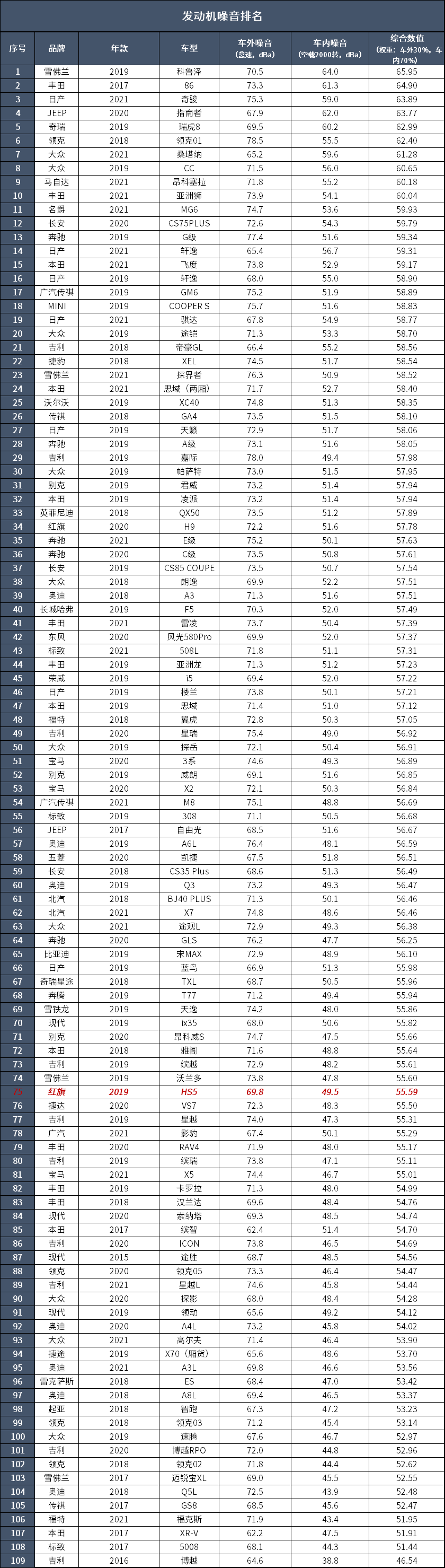 测试方法:发动机完全热机,水温正常,关闭空调,正常怠速下进行测试;打开发动机盖、取下引擎罩,在距离发动机机体上方20厘米处,进行噪音采集,取平均值,为车外发动机噪音数值(dBa);在车内,将车窗关闭,发动机空载运转2000转/分,将噪音仪置于方向盘正上方,取平均值,为车内发动机噪音(dBa)数值。并且以车内30%,车外70%的权重进行综合计算。