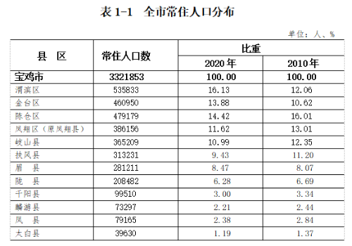 宝鸡市常住人口为3321853人,与2010年第六次全国人口普查的3716731人相比,减少394878人,年平均降低率为1.12%。