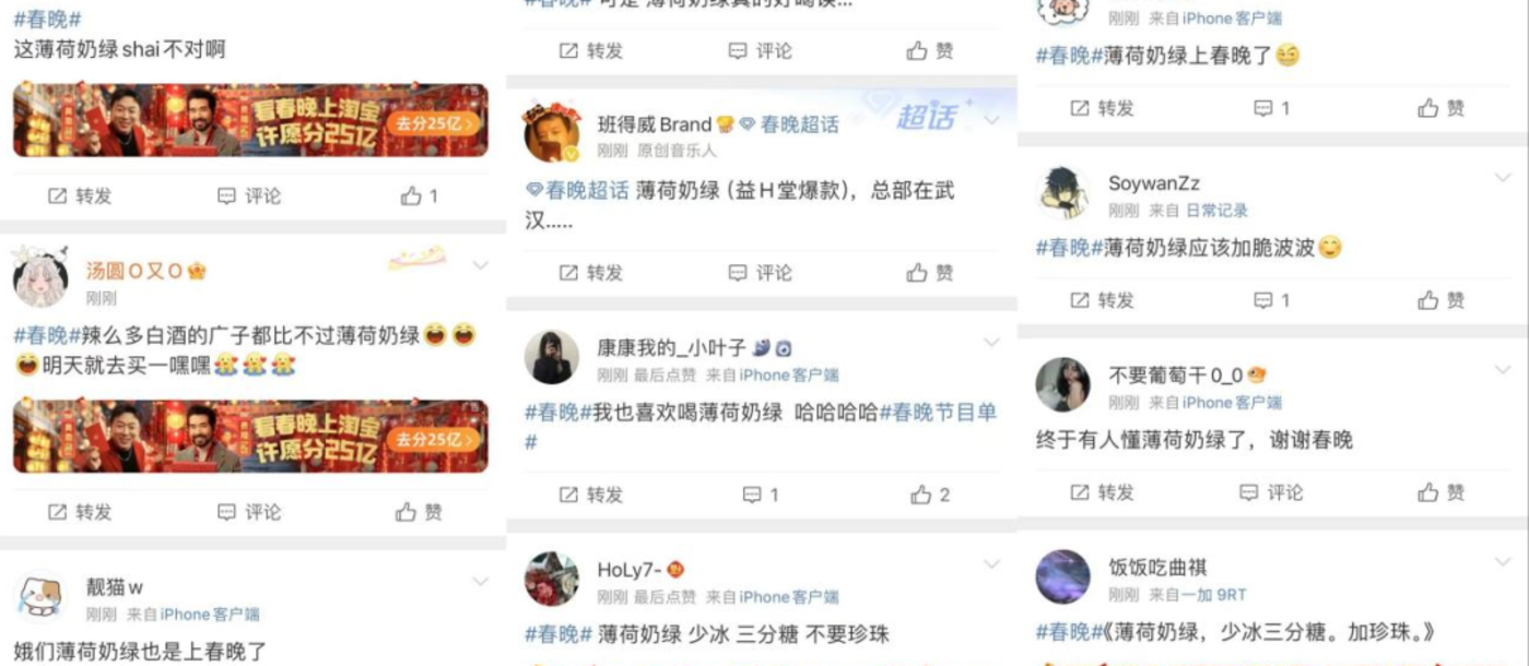 作为益禾堂的爆款单品,「薄荷奶绿」在春晚上 “亮相”后,不少网友纷纷猜测 “益禾堂赞助春晚了?”