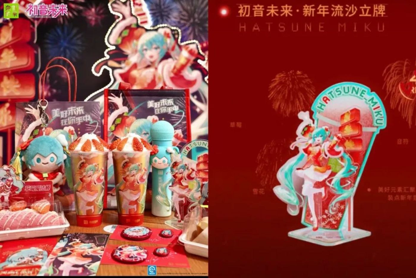 不同的是,奈雪联名绑定了初音未来这一大IP,新年新品“奈雪莓好未来小红瓶”采用的“镭射杯”,被称 “奈雪最值得收藏的杯子”,徽章、镭射票、流沙立牌、麦克风保温杯、红包以及主题杯套、袋装等设计都融合了初音未来人物形象以及新年元素,成功吸引了大量谷子爱好者。