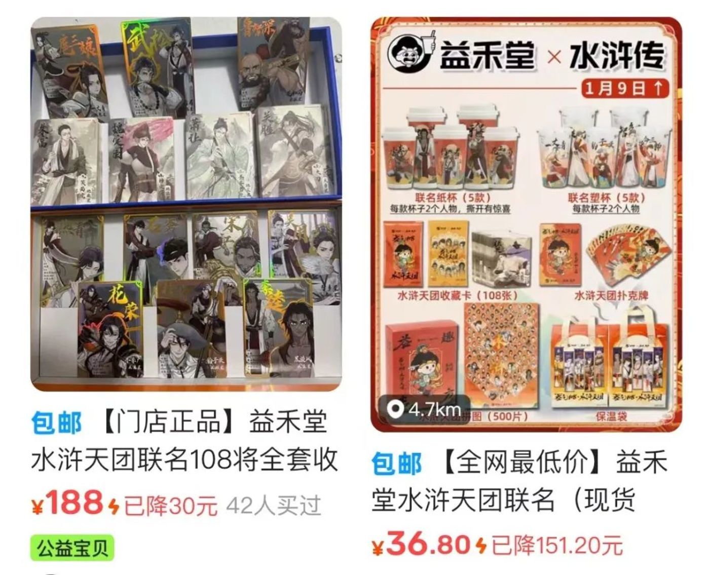 二手交易平台也掀起了一阵交易热潮,“闲鱼买 108 张花了 188”“一张吴用卖了 22”,真实的交易记录背后充分证明了此次联名周边的火爆程度,也侧面反映出益禾堂通过这次联名成功提升了品牌的曝光度与影响力。