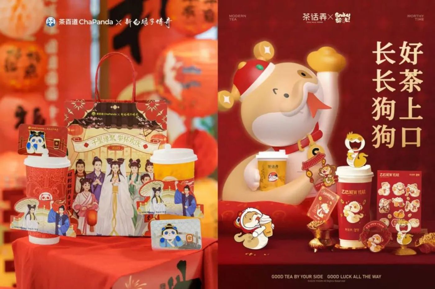 茶百道选择在“2025蛇年新春,让白素贞带着‘四川女婿’许仙回乡过年”为创意点,邀请 92 版《新白娘子传奇》电视剧主演赵雅芝和叶童担任新春欢庆大使,深度绑定这一经典 IP。消费者参与活动能获得联名杯套、纸袋、徽章,还有机会赢取 “净瓶”“金钵” 立体冰箱贴,在蛇年元素与经典 IP 融合方面做得十分出色。