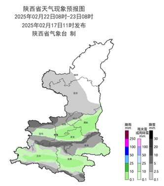 2月22日陕北西部及南部小雪,关中西部、秦巴山区有雨夹雪或中到大雪,关中东部、陕南部分地方有小雨或雨夹雪。