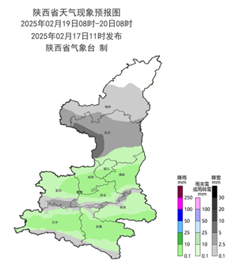 2月19日陕北中南部、关中西北部局地有小到中雪或雨夹雪,陕北西部局地有大雪,关中大部、陕南有小雨或雨夹雪,秦岭山区局地有小到中雪。