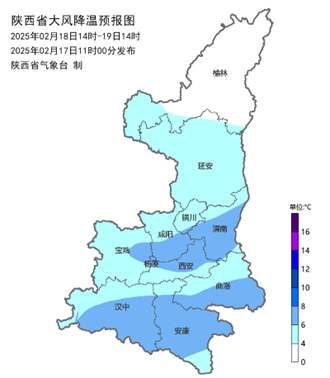 另外受弱冷空气和雨雪天气共同影响,预计2月19日日最高气温下降明显,全省大部下降4℃左右,关中东部、陕南大部下降6-8℃。最低气温出现在20日凌晨。
