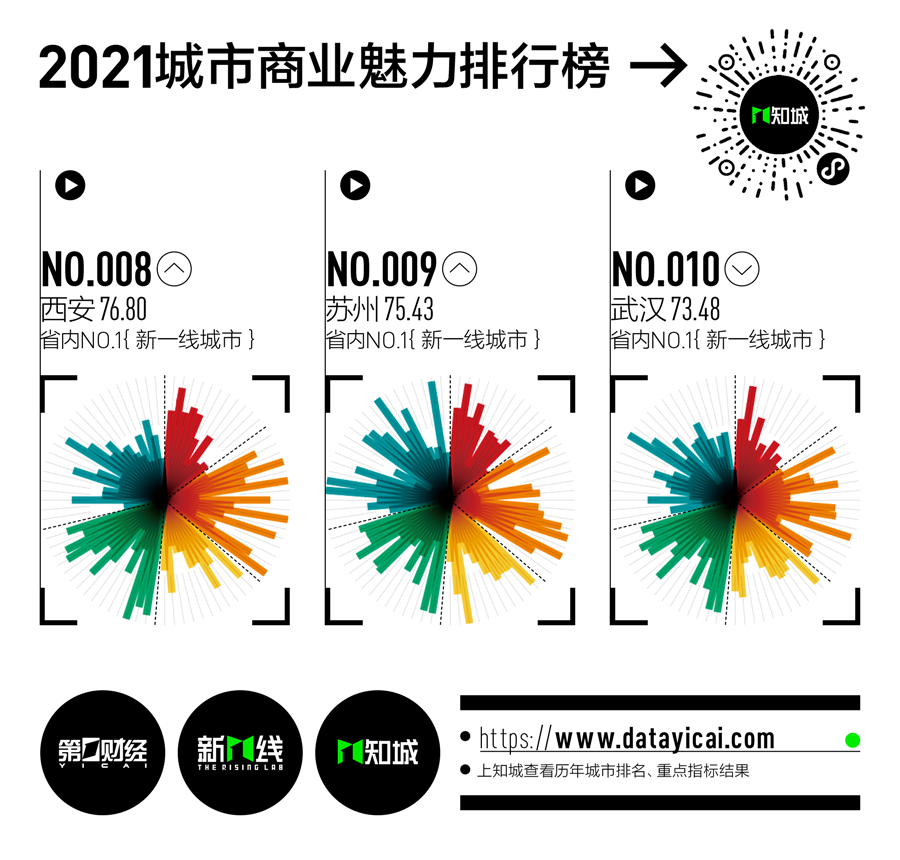 西安上升1位,排在全国第8的位置。作为西北重要的中心城市,西安维持其地理区位上的重要优势,在商业资源区域中心度指数上排到全国第2;在交通联系度指数上排到全国第4,相比去年上升1位。在后疫情时代,西安较成功地提振了城市人的消费信心,其电影、图书等消费数据的排名均有所上升。