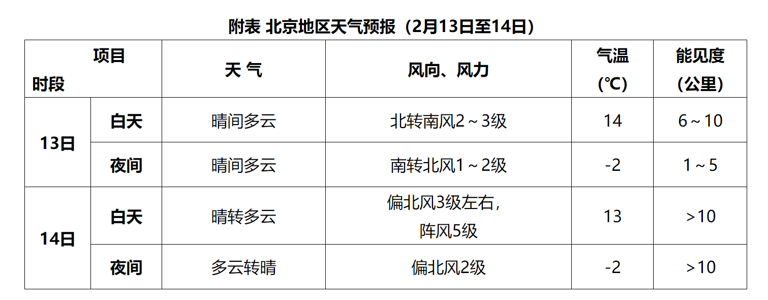 预计,13日至14日北京为晴到多云天气。13日大气扩散条件较差,能见度有所下降,夜间最低能见度1~5公里;14日白天受弱冷空气影响,有3级左右偏北风,阵风5级,山区阵风6级左右,大气扩散条件和能见度转好。期间白天最高气温13~14℃,夜间最低气温-2℃左右。