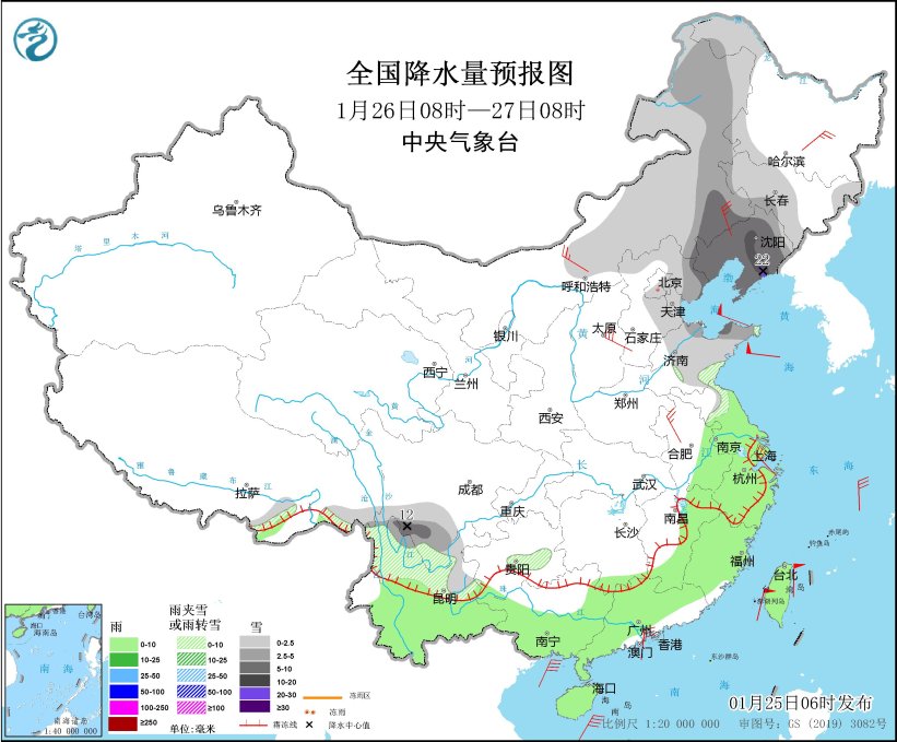 图7 全国降水量预报图(1月25日08时-26日08时)