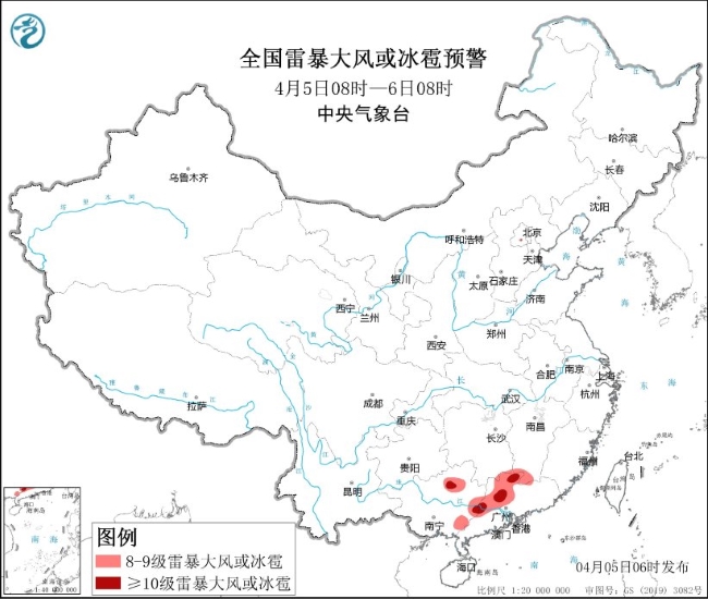 图2 全国雷暴大风或冰雹预警(4月5日08时-6日08时)