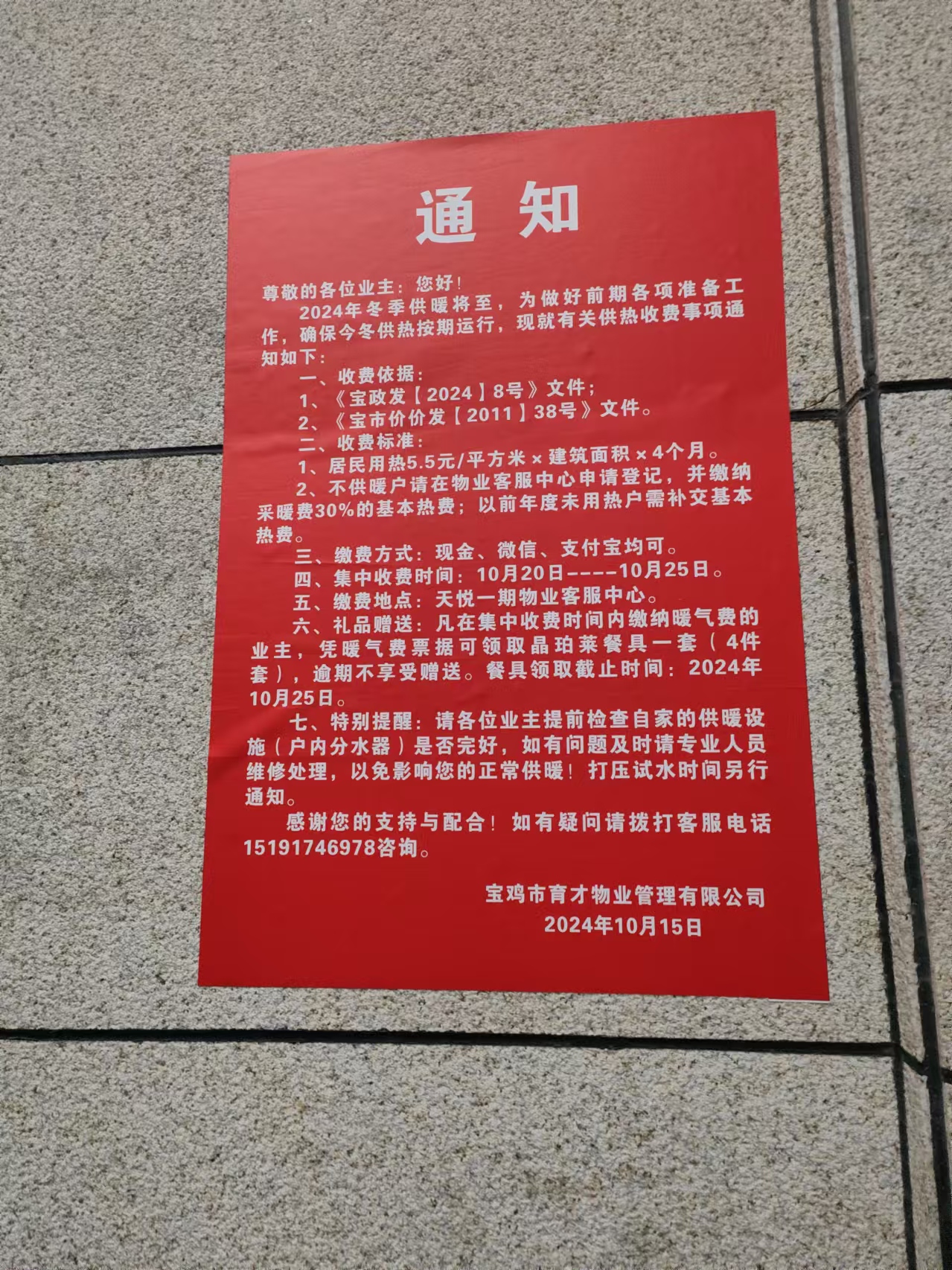 本人为宝鸡市陈仓区千渭街道育才天悦小区业主,今年马上也快供暖季了,本来也是一件好事情,可是就是收费这里出问题了,按照国家规定按照面积收费标准,小区不使用业主不用缴纳过暖费,今年第二年说想去缴费,老人也支持缴纳,突然说要缴纳过暖费,可是小区以往缴纳是按照面积收费的,现在主要矛盾就是小区物业对未使用供暖老业主收取以往过暖费,对以往供暖业主还是按照面积收费,小区物业以及开发商就是利润最大化,过暖费按照面积收费标准,自己老一套。严重损害小区业主民众利益,而且以往小区供暖未接入市政供暖属于自备锅炉房。小区之外的其他开发商楼盘皆给流量计费,也是属于同物业,同开发商,问题究竟在哪里哪个环节出了问题。