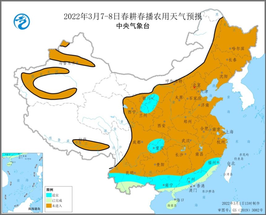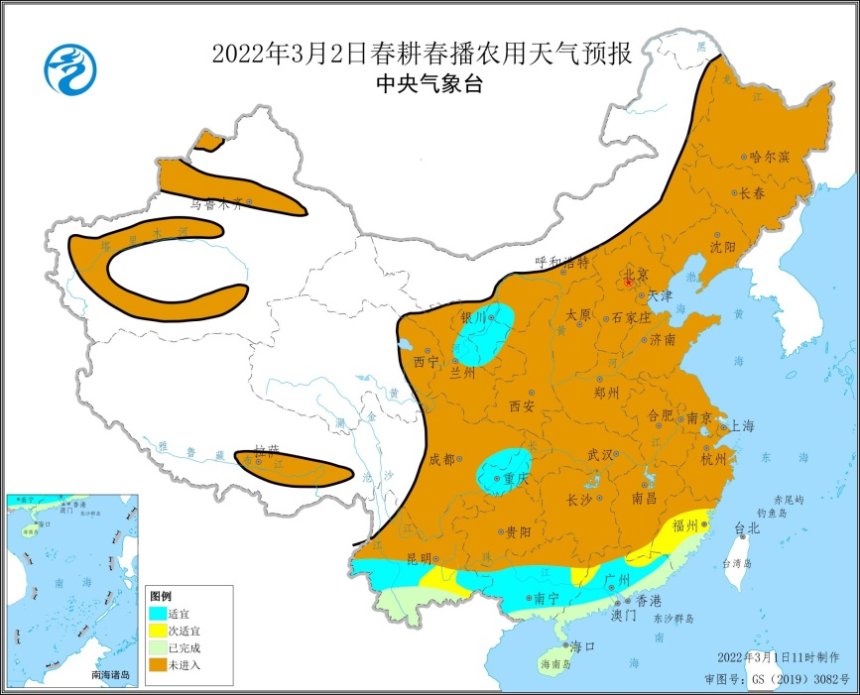据国家气候中心预测,2022年春耕春播期间气象条件总体较好。西北、华北春播区气温接近常年或偏高,利于土壤化冻,农区大部降水接近常年或偏多,大部出现春旱的可能性较小,有利于作物适时播种。东北地区春播气象条件总体较好,农区大部气温偏高1~2℃,利于土壤化冻和备耕整地及春播,黑龙江北部降水偏多,可能出现春涝。南方大部春播区水热条件正常,气象条件基本有利于作物播栽和幼苗生长;江南、华南东部降水偏少,温度偏高,部分地区可能发生春旱。