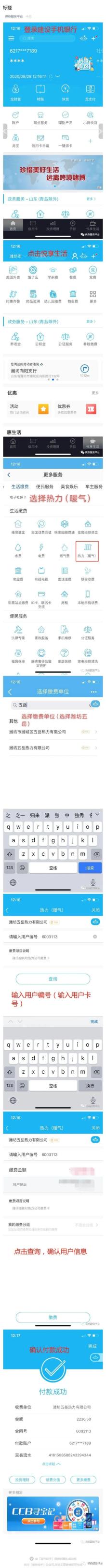 (3)建行微信公众号缴费:微信关注公众号中国建设银行,手机屏下方中间出现悦生活-生活缴费-缴费充值-热力(暖气),选择山东省-潍坊市-潍坊泰和热力费-输入卡号(泰和热力下发的供热缴费卡号)按照提示操作,即可完成缴费。