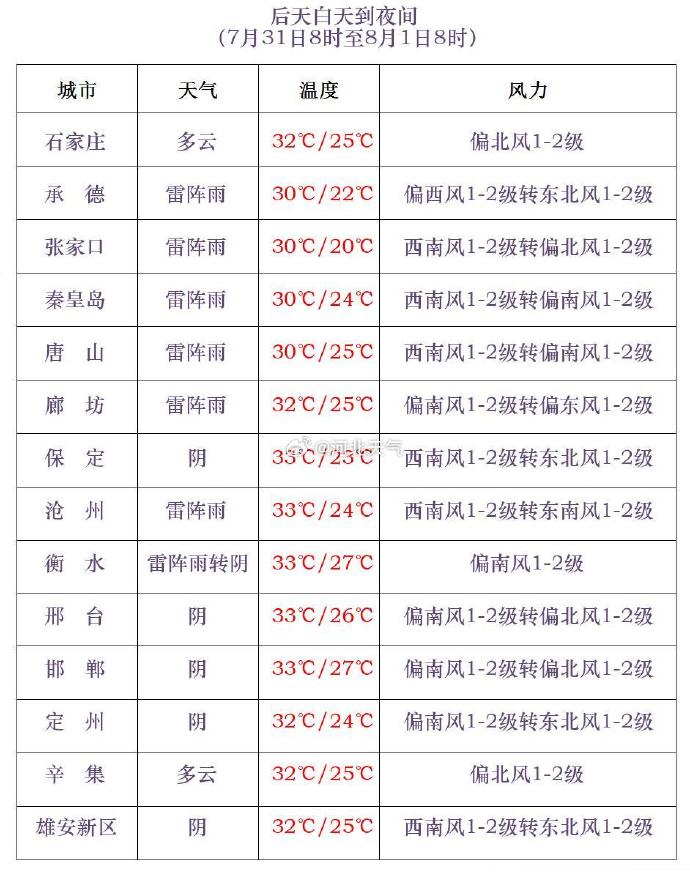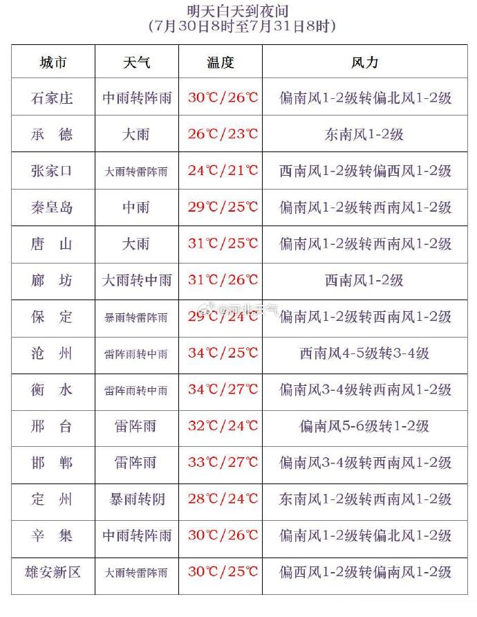 今天下午到夜间,全省阴,大部分地区有雷阵雨或阵雨,其中张家口中南部、承德南部、唐山、秦皇岛、保定、雄安新区、廊坊、石家庄、沧州、衡水北部、邢台中东部有中到大雨,局地有暴雨,个别地点有大暴雨,雷雨时局地伴有短时强降水、短时大风等强对流天气。最高气温,张家口中南部、承德中部、廊坊、唐山中北部、秦皇岛西部、保定、石家庄中北部33~35℃,其他地区26~32℃。最低气温,张家口北部、承德北部、保定西北部17~21℃,其他地区22~26℃。