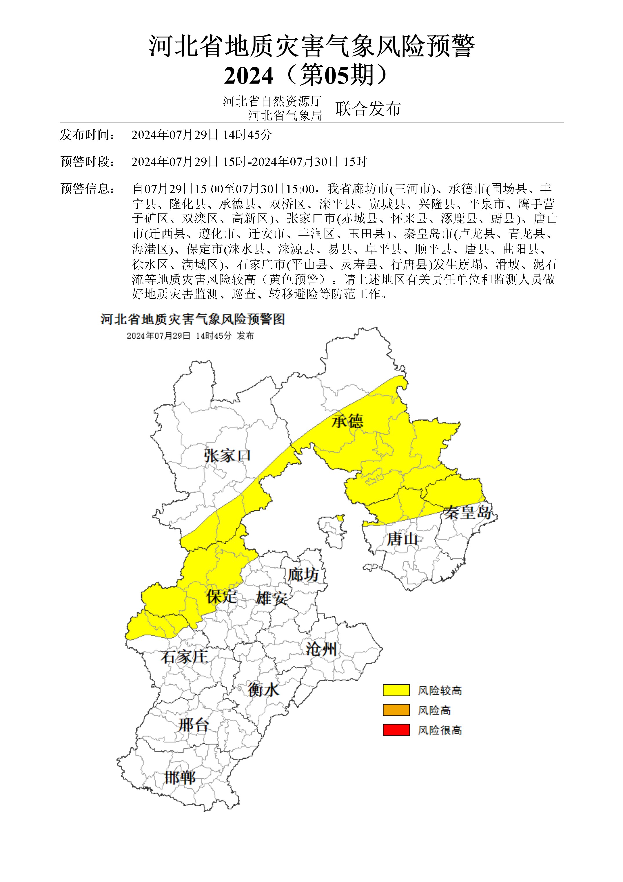 自07月29日15:00至07月30日15:00,我省廊坊市(三河市)、承德市(围场县、丰宁县、隆化县、承德县、双桥区、滦平县、宽城县、兴隆县、平泉市、鹰手营子矿区、双滦区、高新区)、张家口市(赤城县、怀来县、涿鹿县、蔚县)、唐山市(迁西县、遵化市、迁安市、丰润区、玉田县)、秦皇岛市(卢龙县、青龙县、海港区)、保定市(涞水县、涞源县、易县、阜平县、顺平县、唐县、曲阳县、徐水区、满城区)、石家庄市(平山县、灵寿县、行唐县)发生崩塌、滑坡、泥石流等地质灾害风险较高(黄色预警)。请上述地区有关责任单位和监测人员做好地质灾害监测、巡查、转移避险等防范工作。