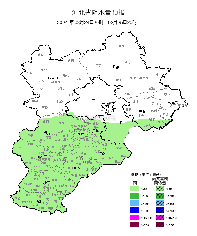 明天夜间到25日,全省阴转多云,保定、廊坊及以南地区有小雨,其中邢台南部、邯郸局地有中雨。