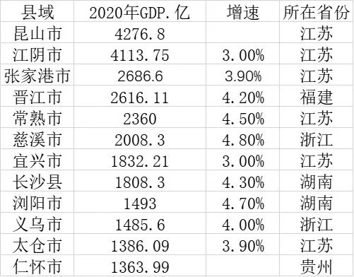 第一财经记者通过对各大强县2020年GDP统计梳理发现,2020年十大经济强县分别是昆山、江阴、张家港、晋江、常熟、慈溪、宜兴、长沙县、浏阳和义乌,共分布在四个省份,其中江苏占据一半之多。昆山、江阴均超4000亿元,晋江则进一步逼近张家港。前十之外,来自西部的酒都仁怀位居第十二,继续向前十发起冲刺。