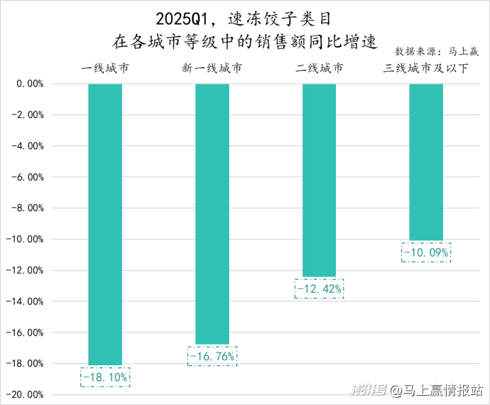 从城市等级角度来看,2025年Q1速冻汤圆类目在各城市等级的销售额同比增速均不容乐观。其中,一线城市最为严重,下跌幅度高达12.66% ,新一线城市、二线城市和三线城市及以下均有不同程度的下跌,下跌幅度与城市等级呈现负相关关系,即城市等级越高,下滑程度越严重。