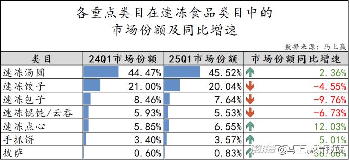在速冻食品大类目内,我们在本季度选取了:速冻饺子、速冻点心、速冻包子、速冻汤圆、速冻馄饨/云吞、披萨、手抓饼7个较有典型性与代表性的类目进行重点回顾。以2025Q1市场份额计算,上述重点类目在速冻食品类目中的市场份额合计>89%。