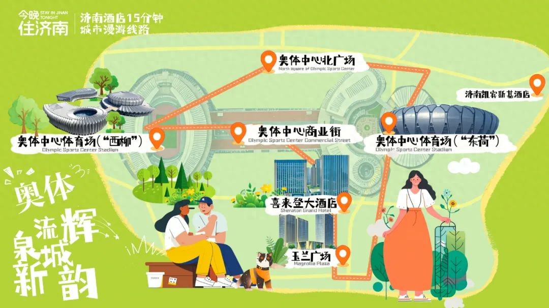 入住喜来登,即步入济南CBD的璀璨画卷。奥体中心“东荷西柳”建筑群尽收眼底,“东荷”体育馆游泳馆的巨型荷叶造型,与西侧“柳叶”体育场共绘“东荷西柳”的山水长卷。从奥体中心北广场开放式观景台朝北望,汉峪金谷超高层如云端山峰挺拔,南部药山轮廓隐约可见。步入汉峪金谷,在凯宾斯基北侧下沉广场打卡“洛杉济”三件套,邂逅超绝城市天际线。暮色渐浓,沿龙奥北路悠然返程,心中满载着流光溢彩的记忆。