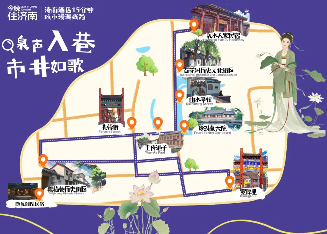 线路点位:泉水人家民宿→百花洲历史文化街区→曲水亭街→王府池子→芙蓉街→宽厚里→鞭指巷历史街区→珍珠泉大院→泉水人家民宿