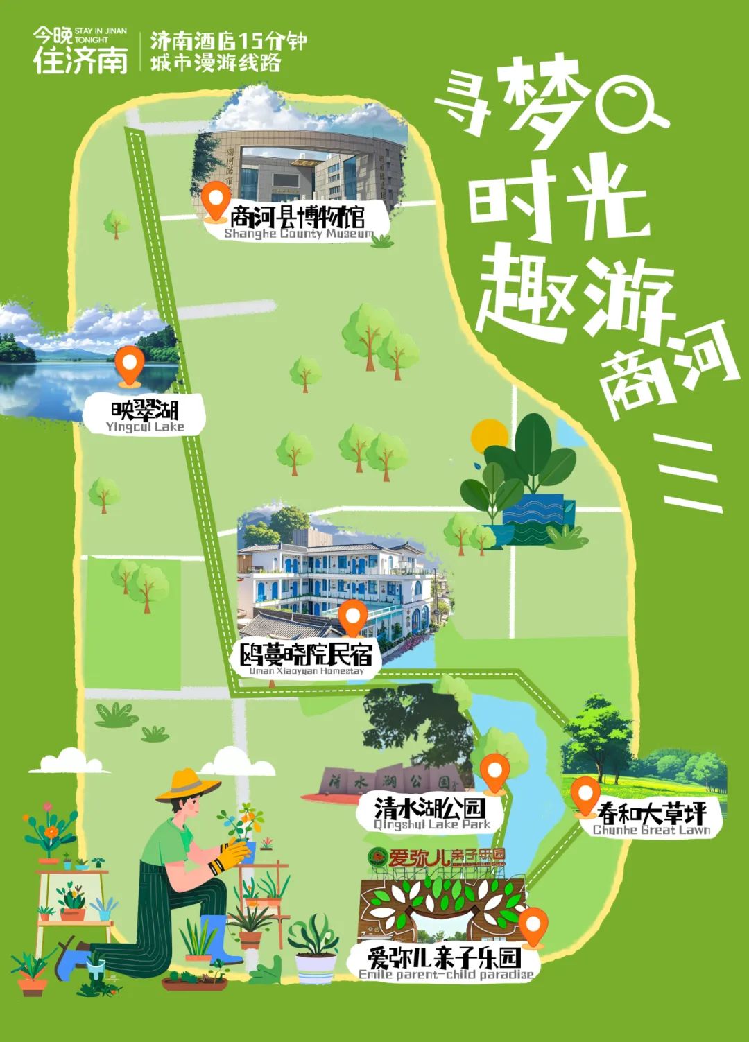 线路点位:鸥蔓晓院民宿→商河县博物馆→映翠湖→清水湖公园→爱弥儿亲子乐园→春和大草坪→鸥蔓晓院民宿