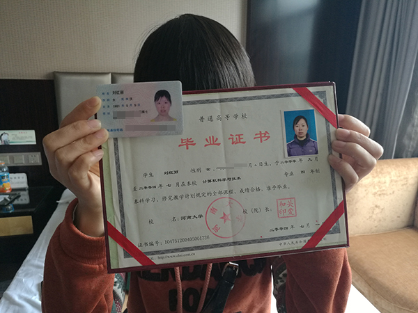 刘红丽回忆,12年前,她曾将毕业证书借给同事赵志平(程方方的远亲),“他说亲戚家的闺女找工作,想仿造一个,没想到竟然冒用了我的信息”。