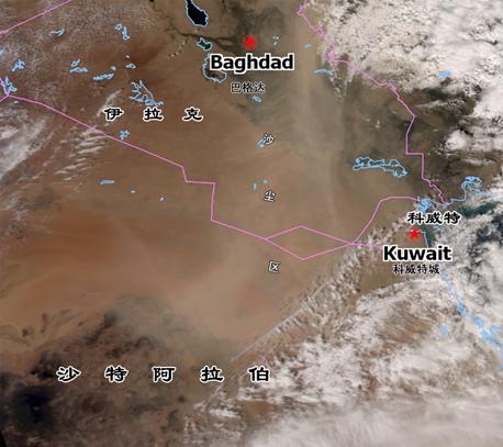 我国FY-3A气象卫星2012年4月5号下午(北京时)监测到中东地区出现沙尘天气。当地的沙尘天气主要起源于伊拉克境内以及沙特北部地区(图8),沙尘区逐渐越过巴格达上空,向下游的科威特蔓延。
