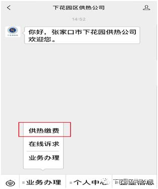 进入公众号,点击“业务办理”,然后再点击“供热缴费”。