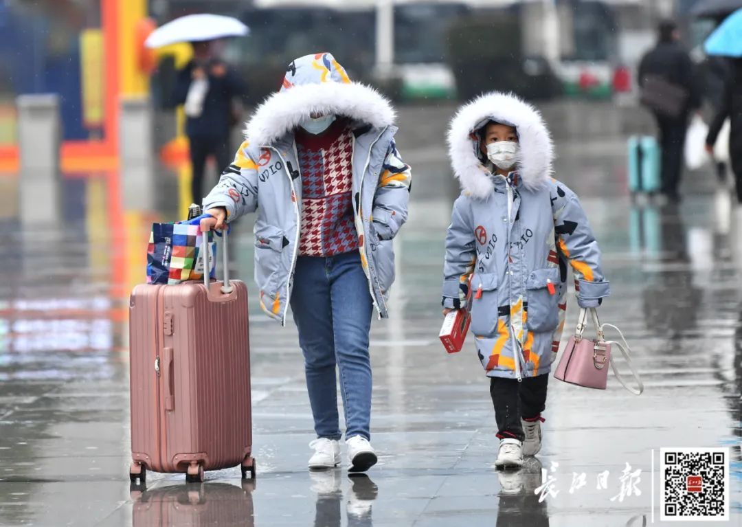 1月24日,在汉口火车站站前广场,准备回家的旅客在时断时续的小雨中行色匆匆。记者喻志勇 摄