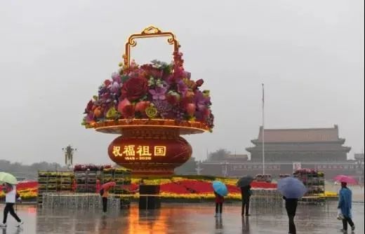 雨中初亮相 天安门广场祝福祖国巨型花篮吊装完成