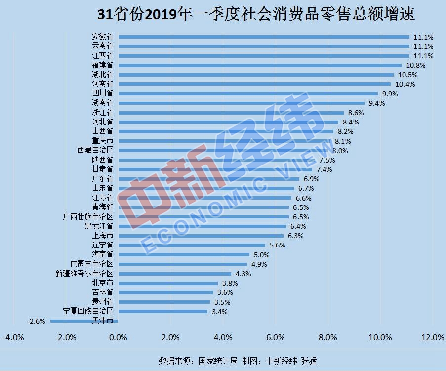 6省份社会消费品零售总额实现两位数增长。安徽、江西、云南三省份增速均为11.1%,并列第一位。福建、湖北、河南三省的增速分别为10.8%、10.5%和10.4%紧随其后。